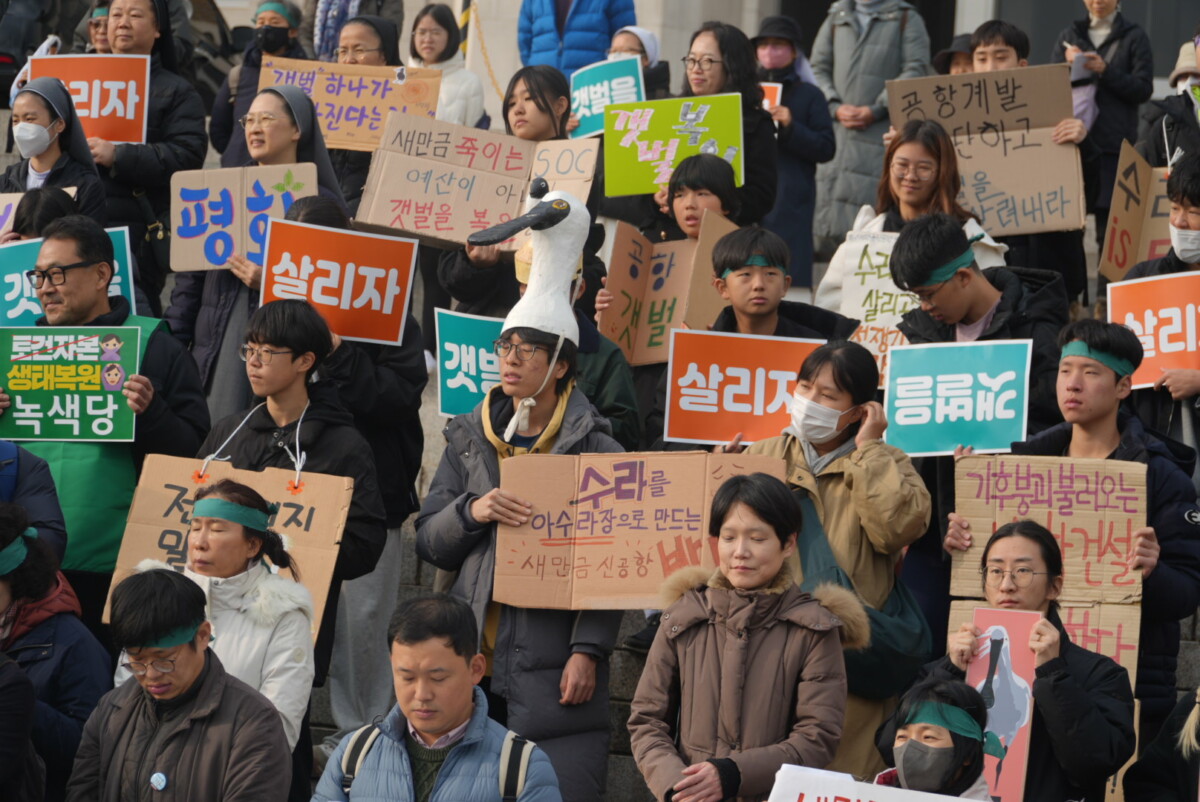 오늘 국회에서 열린 새만금 SOC 예산삭감·갯벌복원 촉구 궐기대회에 많은 분들이 함께 해주셨습니다. 멀리 대구, 광주, 군산, 완주, 장수, 전주, 대전, 세종, 청주, 부천, 고양, 서울 등등에서 160여명의 친구들이 국회의사당 앞 계단에 모여 갯벌 죽이는 새만금 SOC 예산 삭감하고, 그 예산을 만경-동진강 하구갯벌을 복원하고 보존하는 예산으로 전환하라고 목소리 높여 외쳤습니다. 귀한 예산을 기후붕괴 앞당기는 생태학살이 아니라, 소중한 갯벌과 생명을 살리는데 쓰라고 다같이 외쳤습니다.