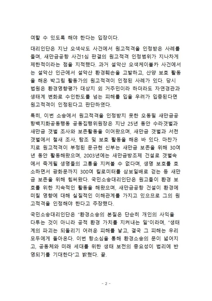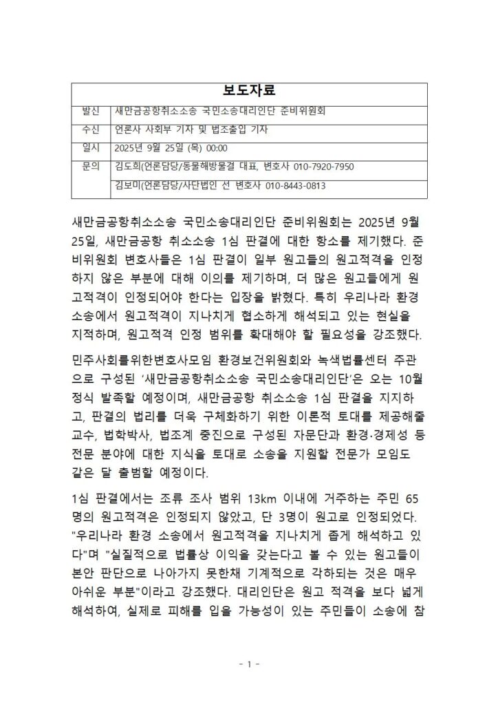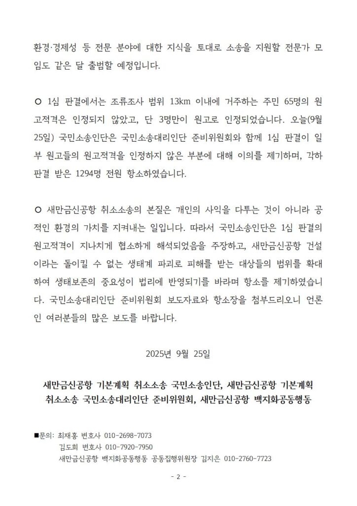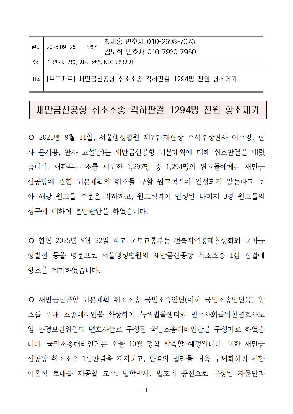 2025년 9월 22일 피고 국토교통부는 전북지역경제활성화와 국가균형발전 등 허구의 명분으로 서울행정법원의 새만금신공항 취소소송 1심 판결에 항소를 제기하였습니다.