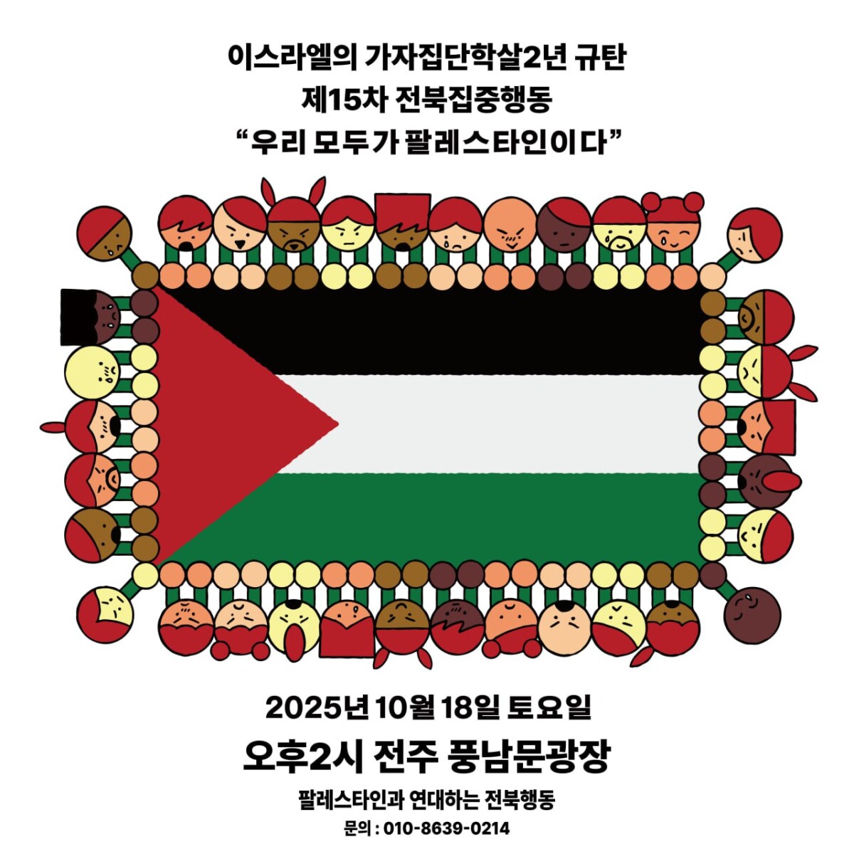 휴전 소식에도 팔레스타인 사람들에 대한 이스라엘의 폭격과 발포를 멈추지 않고 있습니다. 이스라엘의 집단학살과 불법 점령이 완전히 중단되도록 함께 외칩시다! 10월 18일 서울에서 열리는 <팔레스타인과 연대하는 한국 시민사회 긴급행동>에 함께 하지 못하는 분들은 전주에서 팔레스타인 깃발을 함께 들어주세요!
