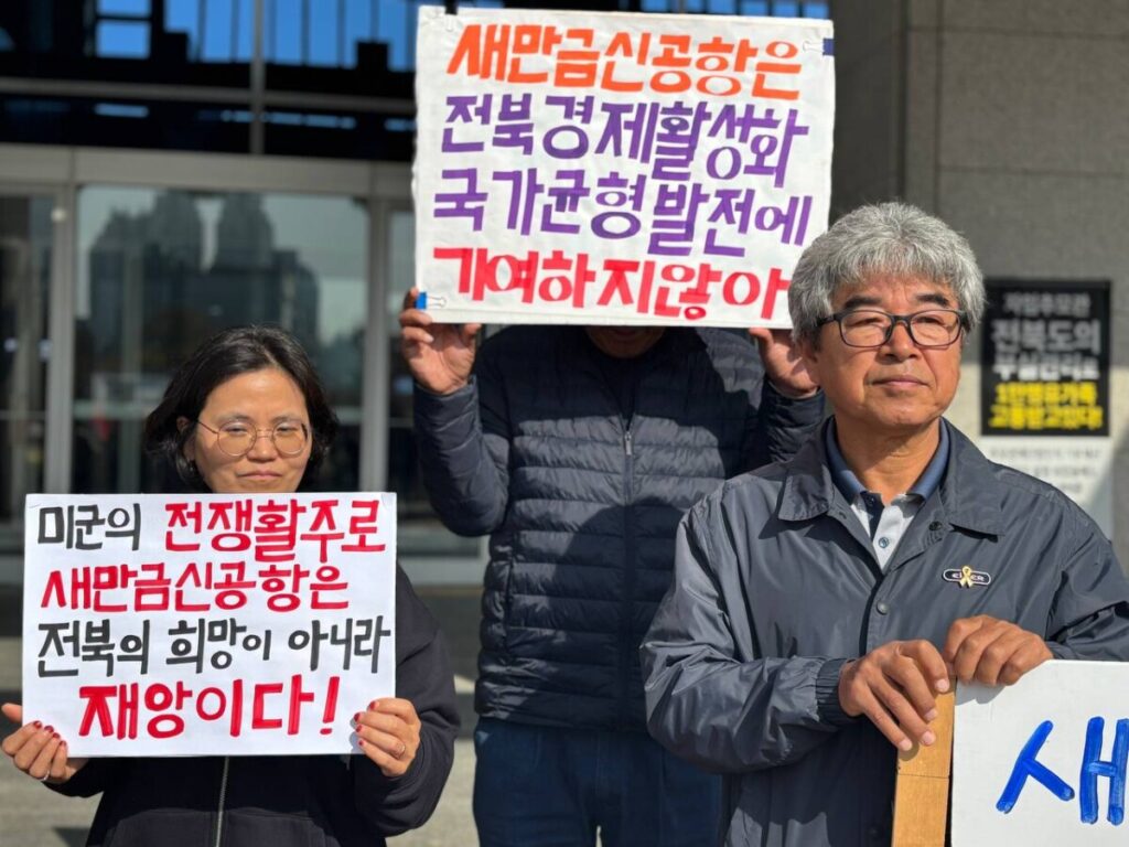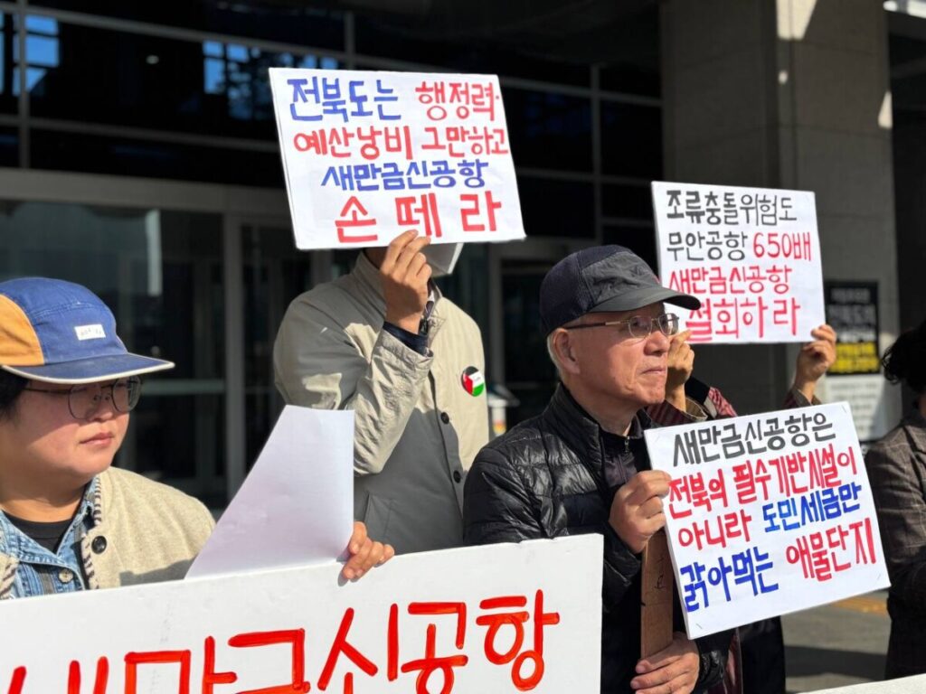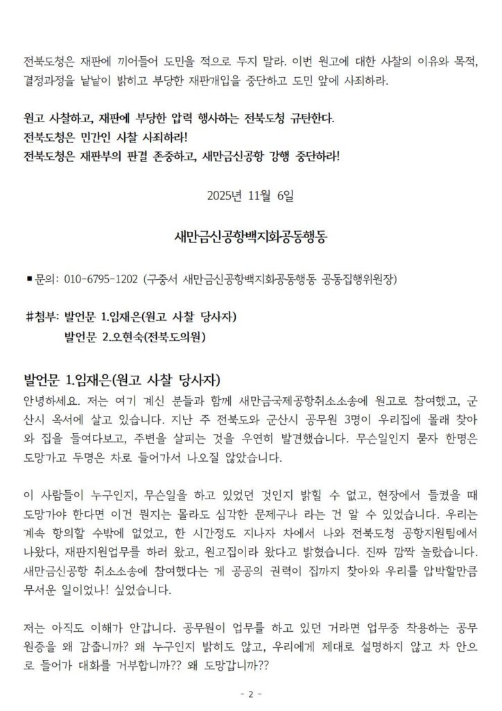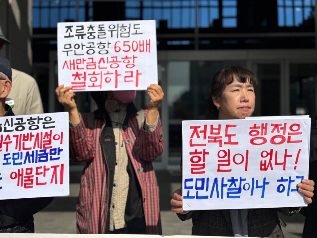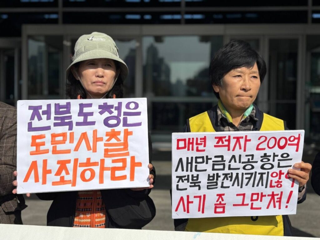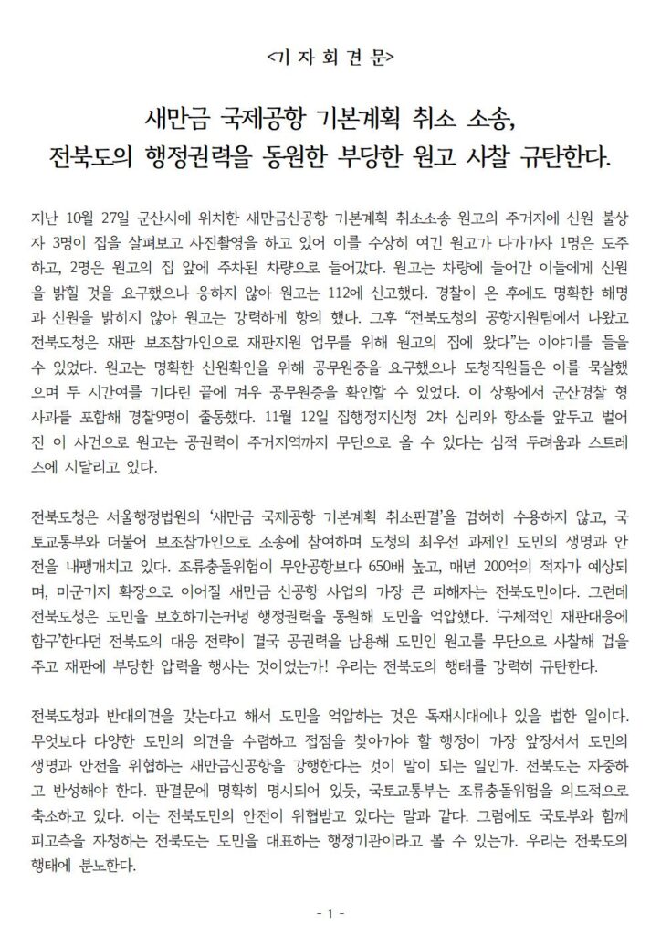 새만금신공항 백지화공동행동은 오늘(11월 6일) 전북도청 현관 앞에서 기자회견을 열고, 행정력과 예산을 남용하여 뭇생명들을 비롯한 도민들의 생명과 안전을 앗아갈 위험천만한 공항을 짓겠다고 소송과 집행정지신청 사건에 개입하고, 보호해야 할 도민들을 감시하고 적과 공격 대상으로 만들어 위협하는 전북도를 규탄했습니다.