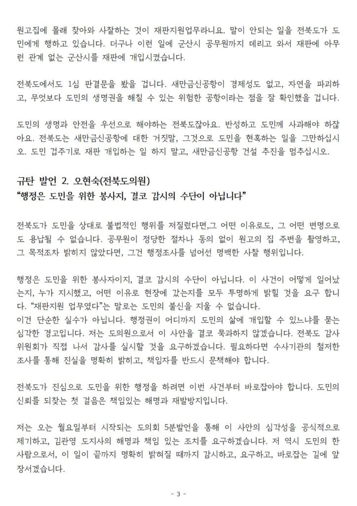 오늘 기자회견 발언자로 나선 오현숙 전북도의원은 “행정은 도민을 위한 봉사자이지 결코 감시의 수단이 아니라면서, 공무원이 정당한 절차나 동의 없이 원고의 집 주변을 촬영하고, 그 목적조차 밝히지 않았다면, 그건 행정조사를 넘어선 명백한 사찰 행위”라고 규탄했습니다. 또한 “전북도 감사위원회가 직접 나서 감사를 실시할 것을 요구하고, 김관영 도지사의 해명과 책임 있는 조치를 요구하겠다”로 밝혔습니다.