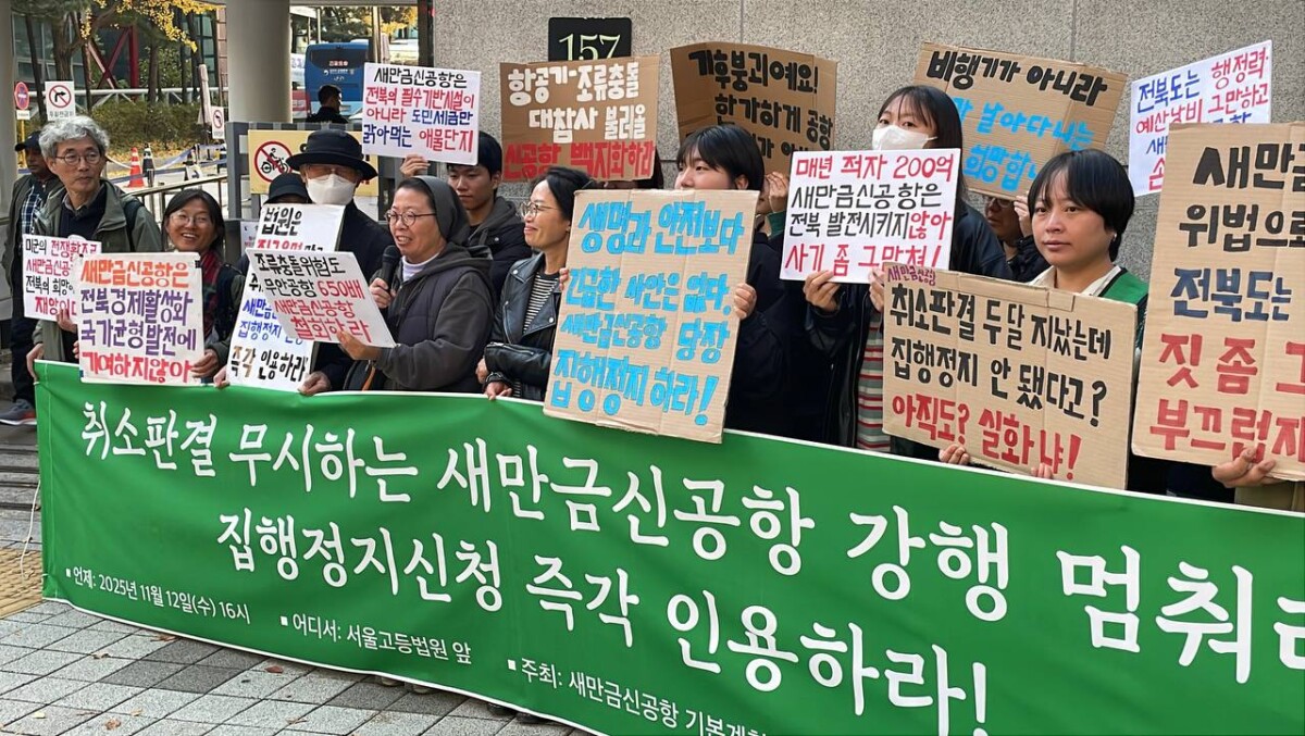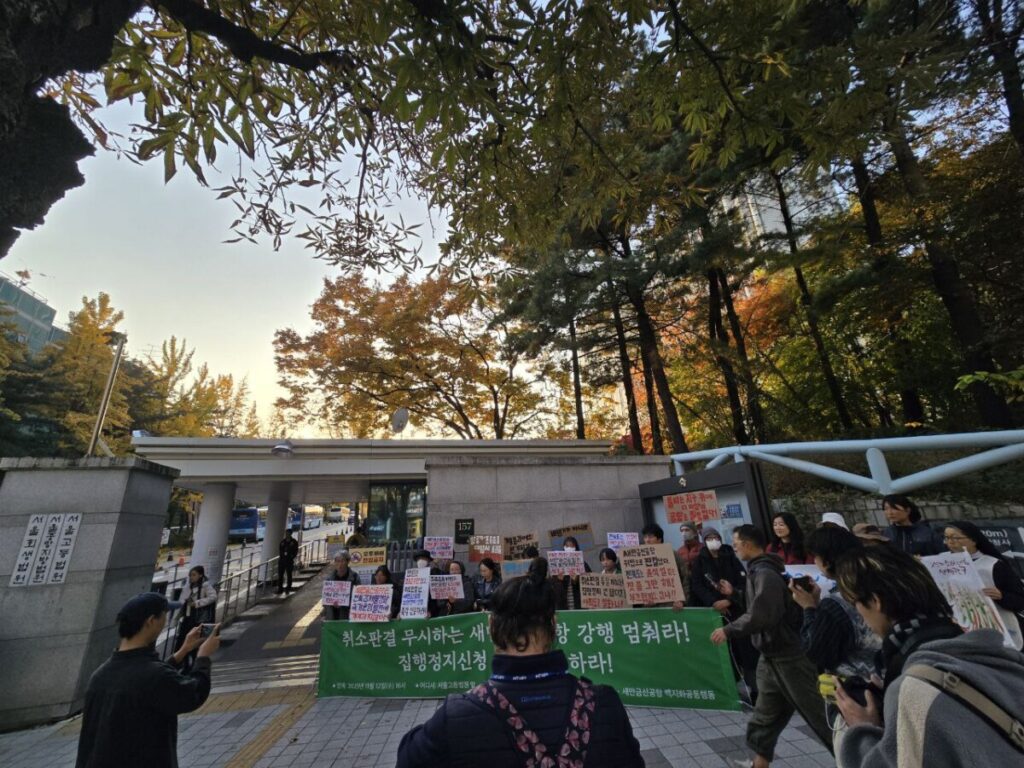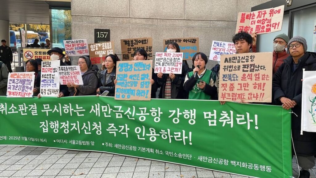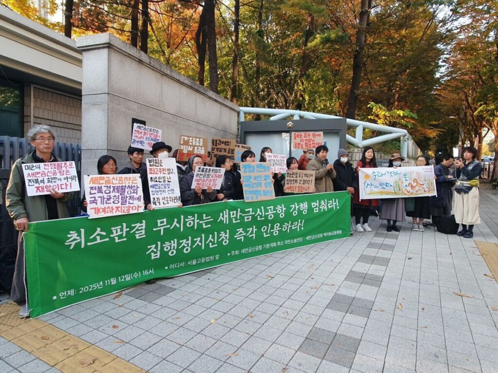 새만금신공항 기본계획 취소 국민소송인단(이하 국민소송인단)은 2025년 9월 11일 서울행정법원의 새만금신공항 기본계획 취소판결 직후 새만금신공항 사업에 대한 모든 절차를 중지시켜달라는 집행정지를 신청했다. 그러나 취소판결이 내려진 지 두 달이 지났는데도 진작에 인용되었어야 할 집행정지신청이 전북 지자체와 정치권의 압박으로 아직도 법원에 묶여있다.