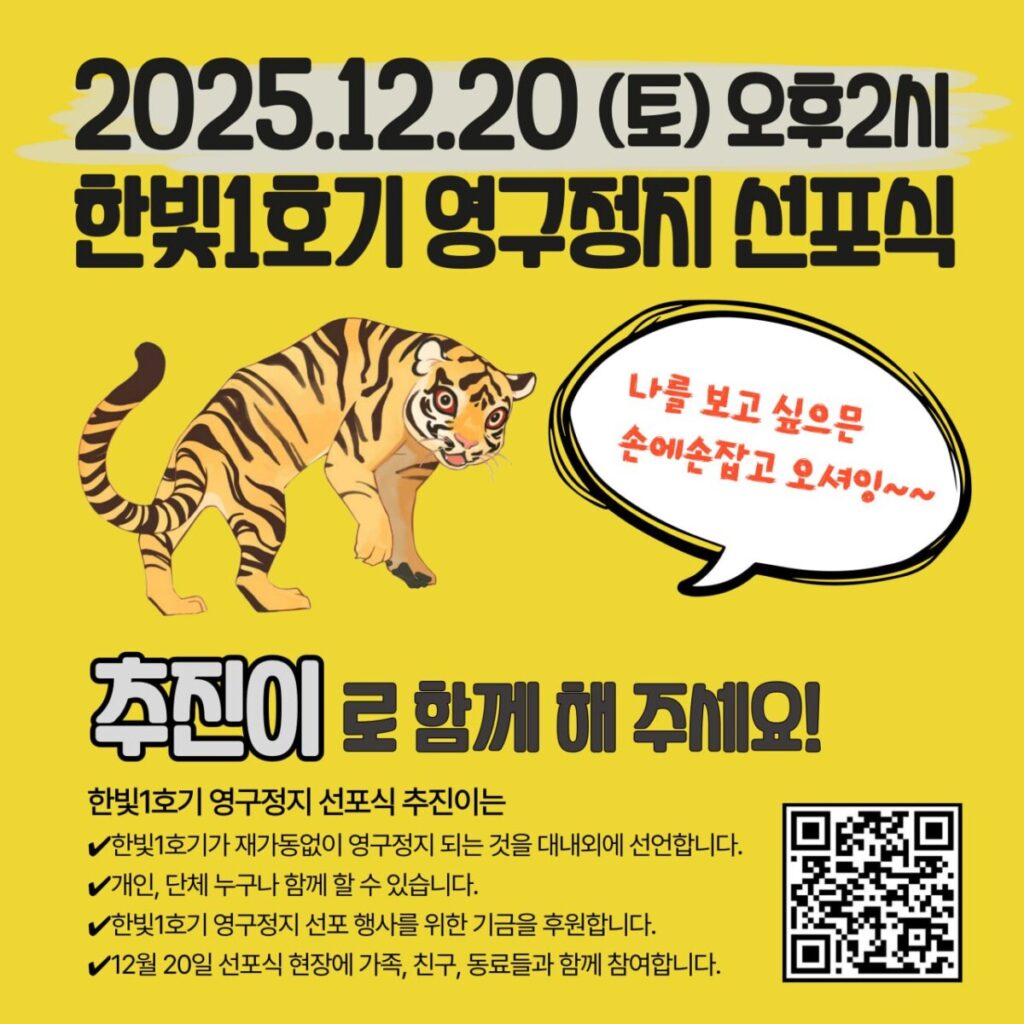 한빛1호기가 재가동 없이 영구정지 되어야 함을 대내외에 선언합니다. 개인, 단체 누구나 함께 할 수 있습니다. 한빛1호기 영구정지 선포 행사를 우리 스스로 만들 수 있도록 후원해 주세요.