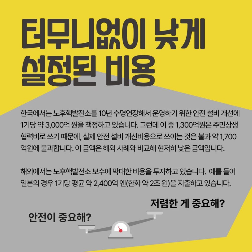 한국에서는 노후핵발전소를 10년 수명연장해서 운영하기 위한 안전 설비 개선에 1기당 약 3,000억 원을 책정하고 있습니다.