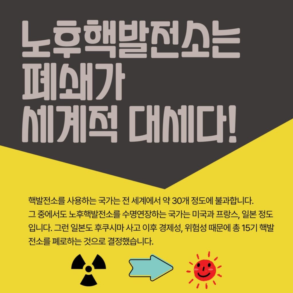 노후핵발전소 수명연장의 문제점, 한빛1.2호기 수명연장해서는 안 되는 이유에 대해 10분으로 알려드립니다. 각 단체 회의와 모임 등에 초대해 주시면 찾아가겠습니다!