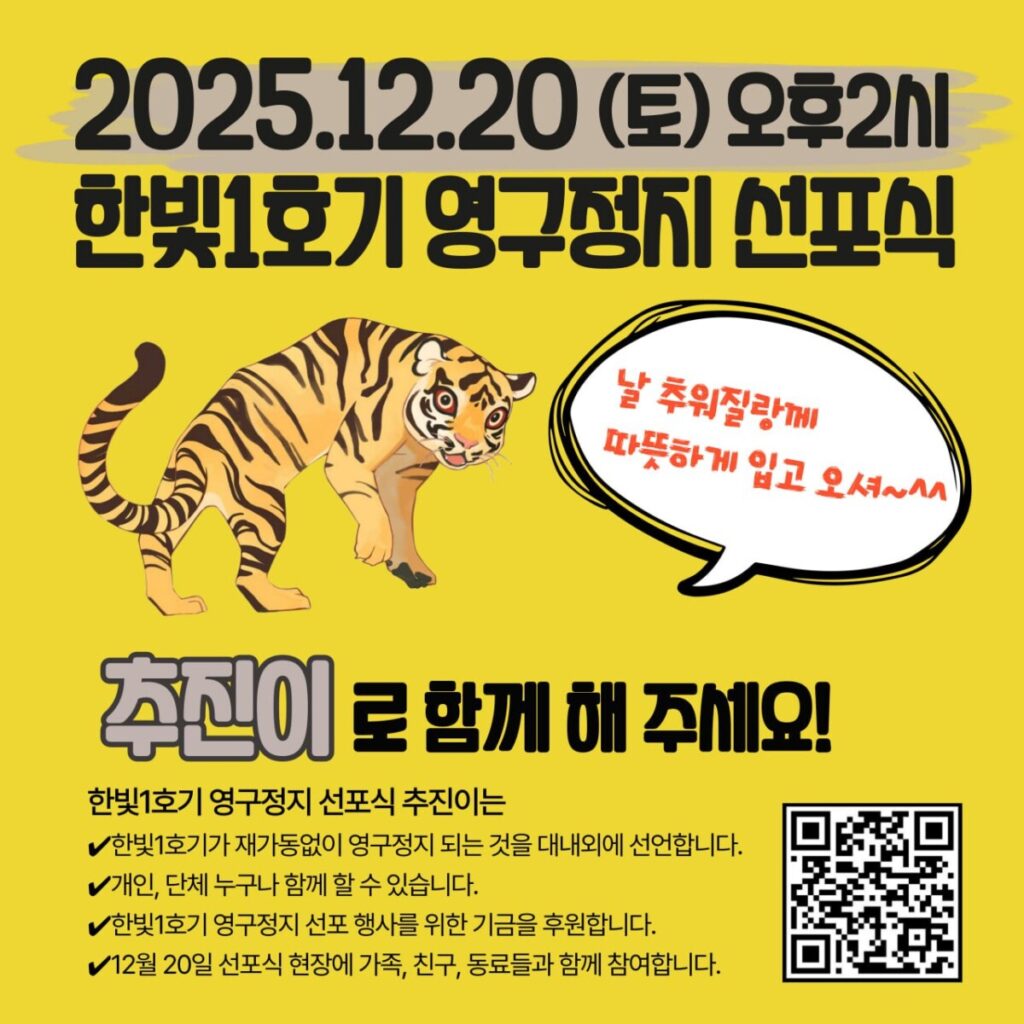 한빛1호기가 재가동 없이 영구정지 되어야 함을 대내외에 선언합니다. 개인, 단체 누구나 함께 할 수 있습니다. 한빛1호기 영구정지 선포 행사를 우리 스스로 만들 수 있도록 후원해 주세요.