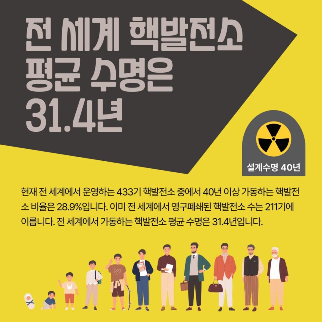 현재 전 세계에서 운영하는 433기 핵발전소 중에서 40년 이상 가동하는 핵발전소 비욜은 28.9%입니다. 이미 전 세계에서 영구폐쇄된 핵발전소 수는 211기에 이릅니다. 전 세계에서 가동하는 핵발전소 평균 수명은 31.4년입니다.