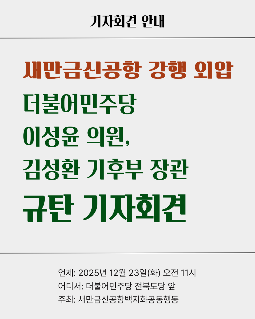 이에 새만금신공항백지화공동행동은 이성윤 의원과 김성환 기후부 장관을 규탄하는 기자회견을 엽니다. 많은 참석 바랍니다!