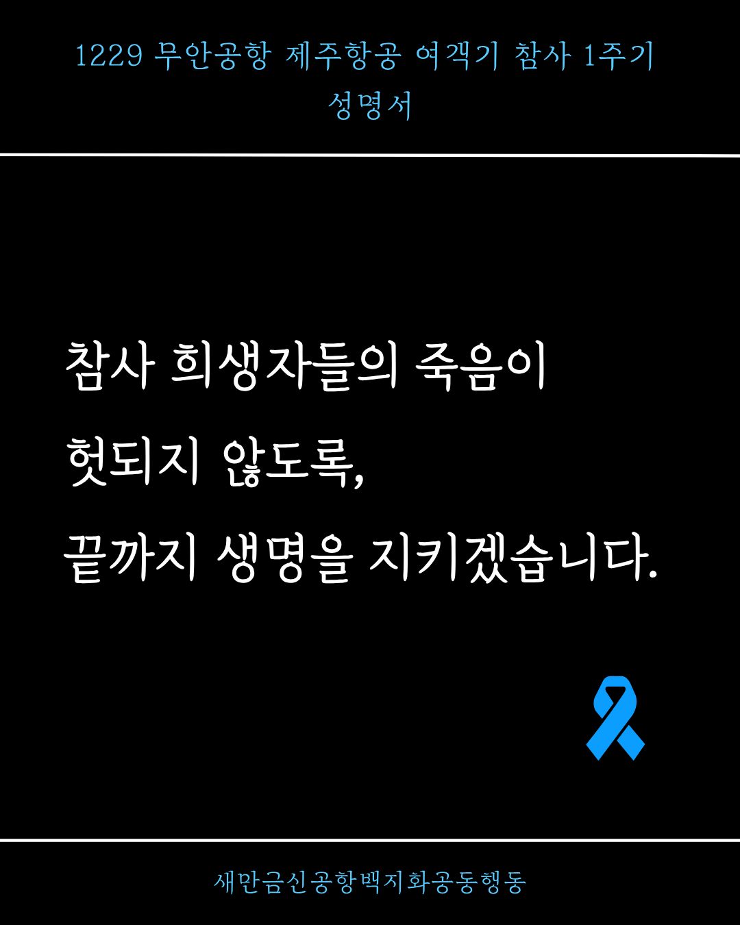 생명과 안전은 보완과 타협의 대상이 될 수 없습니다. 이것이 179명의 소중한 인명이 주는 엄중한 경고입니다. 그러나 어처구니없게도 무안공항을 이름만 ‘김대중공항’으로 바꾸어 재개항하겠다는 뻔뻔한 시도가 정치권에서 이루어지고 있습니다. 무안공항 조류충돌 위험도의 650배인 새만금신공항, 350배인 가덕도신공항을 여전히 추진하려 합니다. 참사 1주기에 가덕도신공항 재입찰 공고를 내는 후안무치한 이들에게는 오직 정치논리만 있을뿐, 생명과 안전은 안중에 없습니다. <새만금신공항백지화공동행동>은 이름세탁, 진상은폐, 책임자 관용을 결코 좌시하지 않겠습니다. 생명의 편에 서서 끝까지 진실을 밝히고, 희생자들의 죽음을 헛되지 않게 하겠습니다. 다시 한 번 희생자들의 명복과 유가족들의 평화를 빕니다.