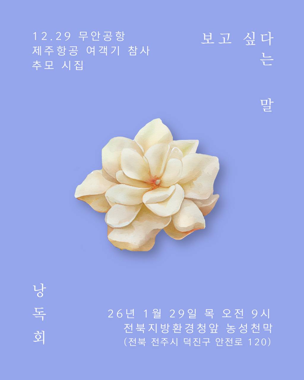 책방 토닥토닥 주최로 1월 29일 목요일에 무안공항 여객기 참사 추모 시집 낭독회를 농성장에서 가집니다.