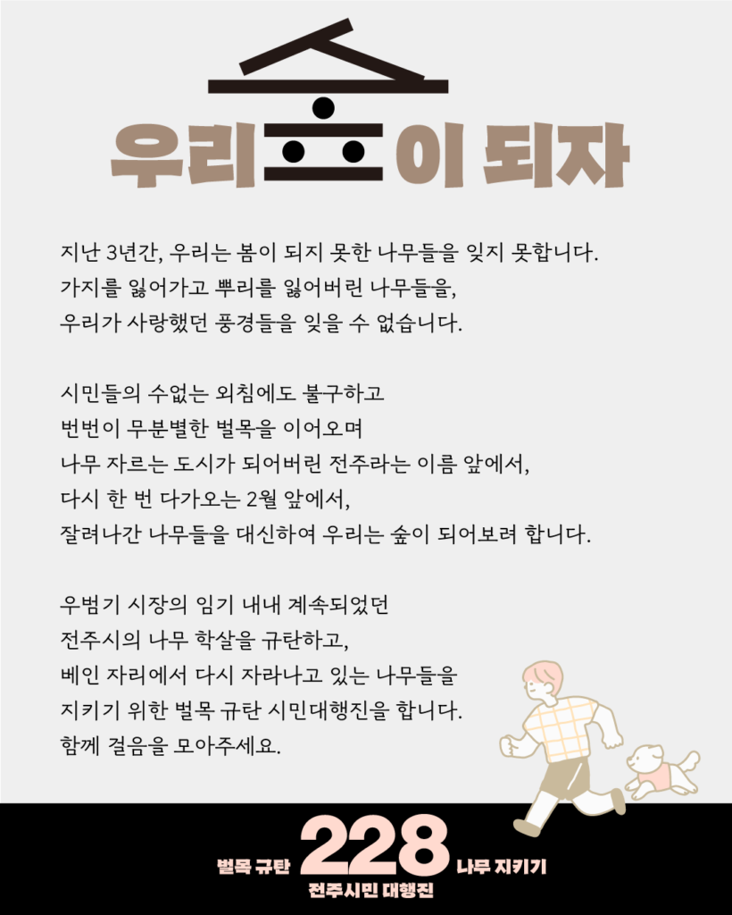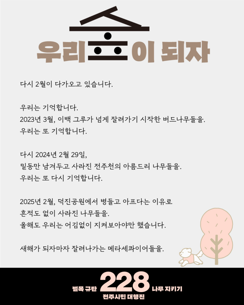 μ§λ 3λ κ°, μ°λ¦¬λ λ΄μ΄ λμ§ λͺ»ν λ무λ€μ μμ§ λͺ»ν©λλ€. κ°μ§λ₯Ό μμ΄κ°κ³ λΏλ¦¬λ₯Ό μμ΄λ²λ¦° λ무λ€μ, μ°λ¦¬κ° μ¬λνλ νκ²½λ€μ μμ μ μμ΅λλ€. μλ―Όλ€μ μμλ μΈμΉ¨μλ λΆκ΅¬νκ³ λ²λ²μ΄ 무λΆλ³ν λ²λͺ©μ μ΄μ΄μ€λ©° λ무 μλ₯΄λ λμκ° λμ΄λ²λ¦° μ μ£ΌλΌλ μ΄λ¦ μμμ, λ€μ ν λ² λ€κ°μ€λ 2μ μμμ, μλ €λκ° λ무λ€μ λμ νμ¬ μ°λ¦¬λ μ²μ΄ λμ΄λ³΄λ € ν©λλ€.