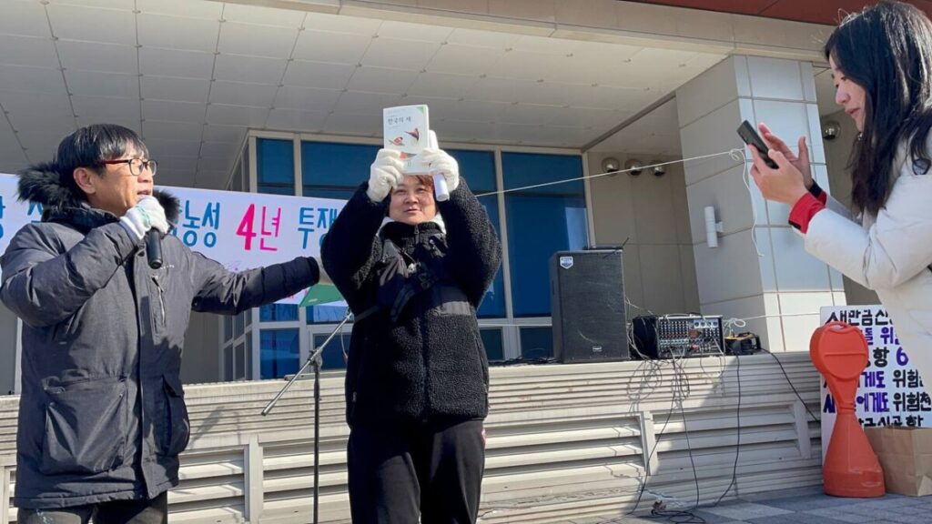천막농성 4주년 투쟁문화제에 제주, 부산, 서울, 천안, 대전, 세종, 무주, 정읍, 군산 등 곳곳에서 많은 분들이 오셔서 함께 해주셨고, 현장에 직접 오시지 못하시는 분들은 전화연결로 편지로 선물로 투쟁기금으로 함께 해주셨어요. 나일 무어스 박사님은 영상통화를 통해 새소리경연대회 심사자로 함께 해주셨어요. 세종 농성장에서 열심히 함께 해주신 송영욱 동지와 문경희 동지가 뭉클한 편지를 보내주셨어요. 우리 투쟁의 중요한 국면이나 행사 때마다 늘 귀한 사과를 보내주시는 함양의 마용운 선생님께서 이번에도 사과와 사과쥬스를 듬뿍 보내주셔서 오신 동지들과 두루두루 나누었습니다. 집회나 기자회견 때마다 취재오셨던 경향신문 기자님께서도 어제 취재 오시면서 맛있는 떡을 선물해주셨어요. 응원공원을 위해 금강에서부터 오신 대전충남녹색연합 임도훈 동지께서도 재능기부로 좋은 힘을 보태어주셨습니다. 언제나 든든한 동지인 김형우 동지와 팽수 동지들은 힘있는 노래와 신명나는 풍물로 투쟁 문화제 마지막 시간을 뜨겁게 마무리해주셨어요. 그리고 많은 분들이 소리도 없이 든든한 투쟁기금을 보태어주셨습니다. 오동필 단장님은 직접 만든 조개 액자와 새도감을 새소리경연대회 선물로 준비해오셨어요. 다시 이 아름다운 생명들이 수라갯벌에서, 만경강·동진강 하구 갯벌에서 살아갈 수 있길 바라는 간절한 마음 담아서..