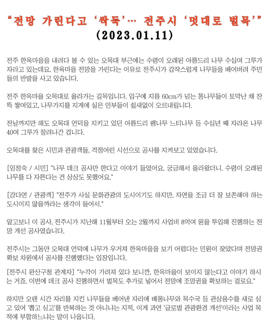 2023년부터 무차별로 진행된 전주시 벌목들에 관한 기사 모음집을 공유드립니다.